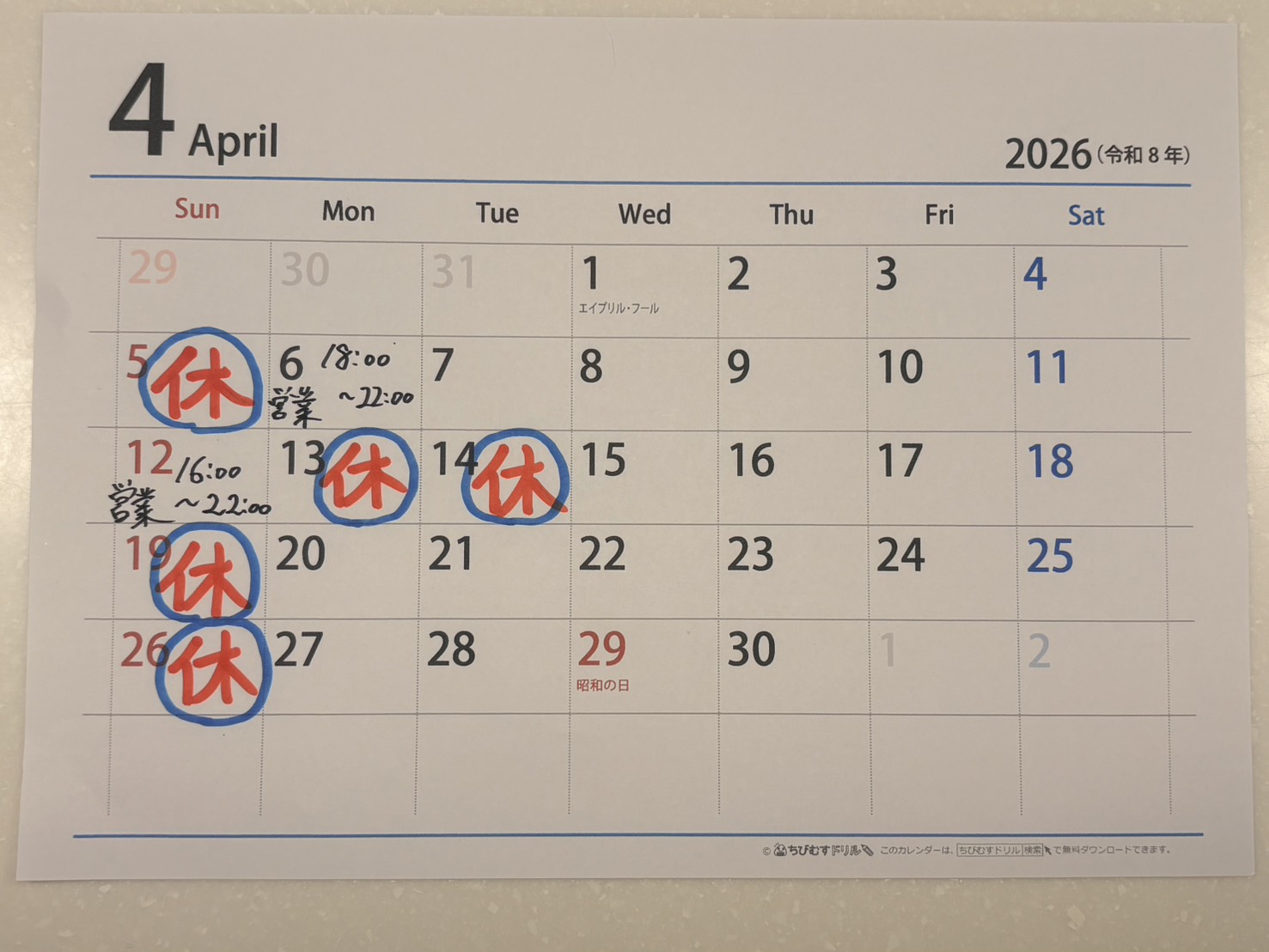 4月の休業日のお知らせ